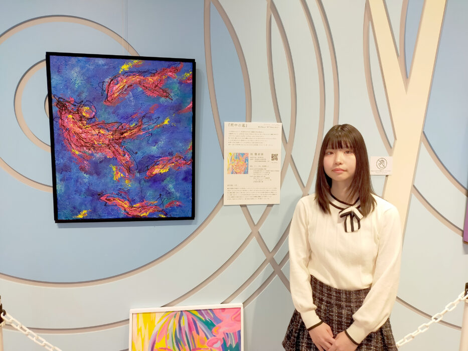 「鑑賞者と対話できるような絵を描きたいと思っています。逆境下でも努力する姿は美しいと感じ、水の渦の中を逆らうように泳ぐ金魚を抽象的に描きました」。