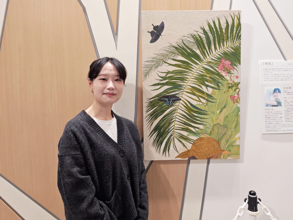 【作品について】「故郷が開発されていく様子に寂しさを感じます。絵に描かれたソテツは、家の近くに生えているものです。クロアゲハは、虫捕りが好きだった子ども時代、夏になると現れていた思い出があります」。