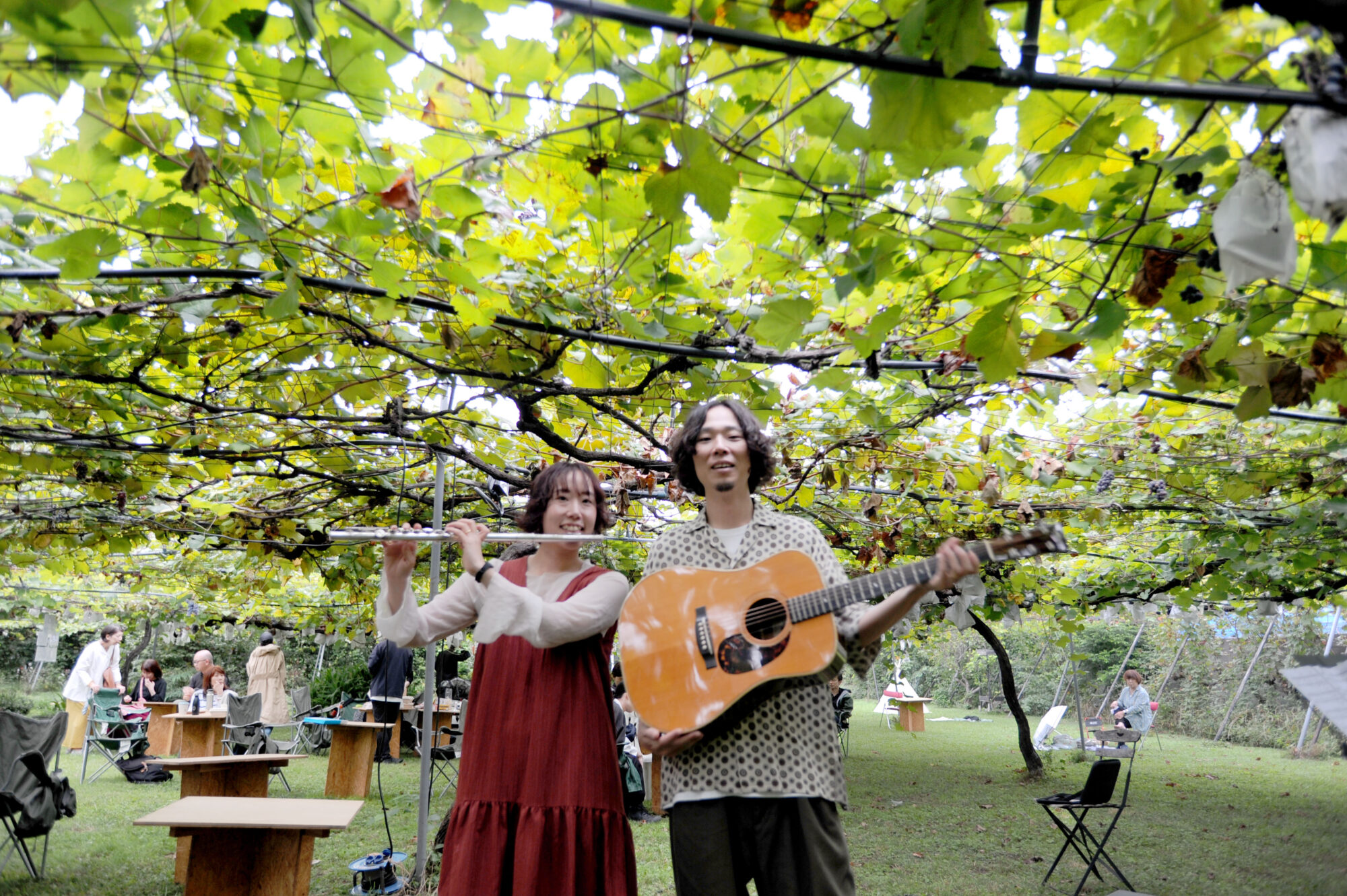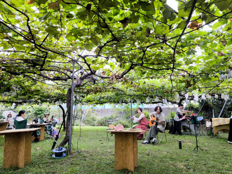 雨予報が出ていたイベント当日。すでに場内では、来場者がぶどう棚の下に並べられたチェアにもたれながら、音楽ライブを楽しんでいる様子だった。