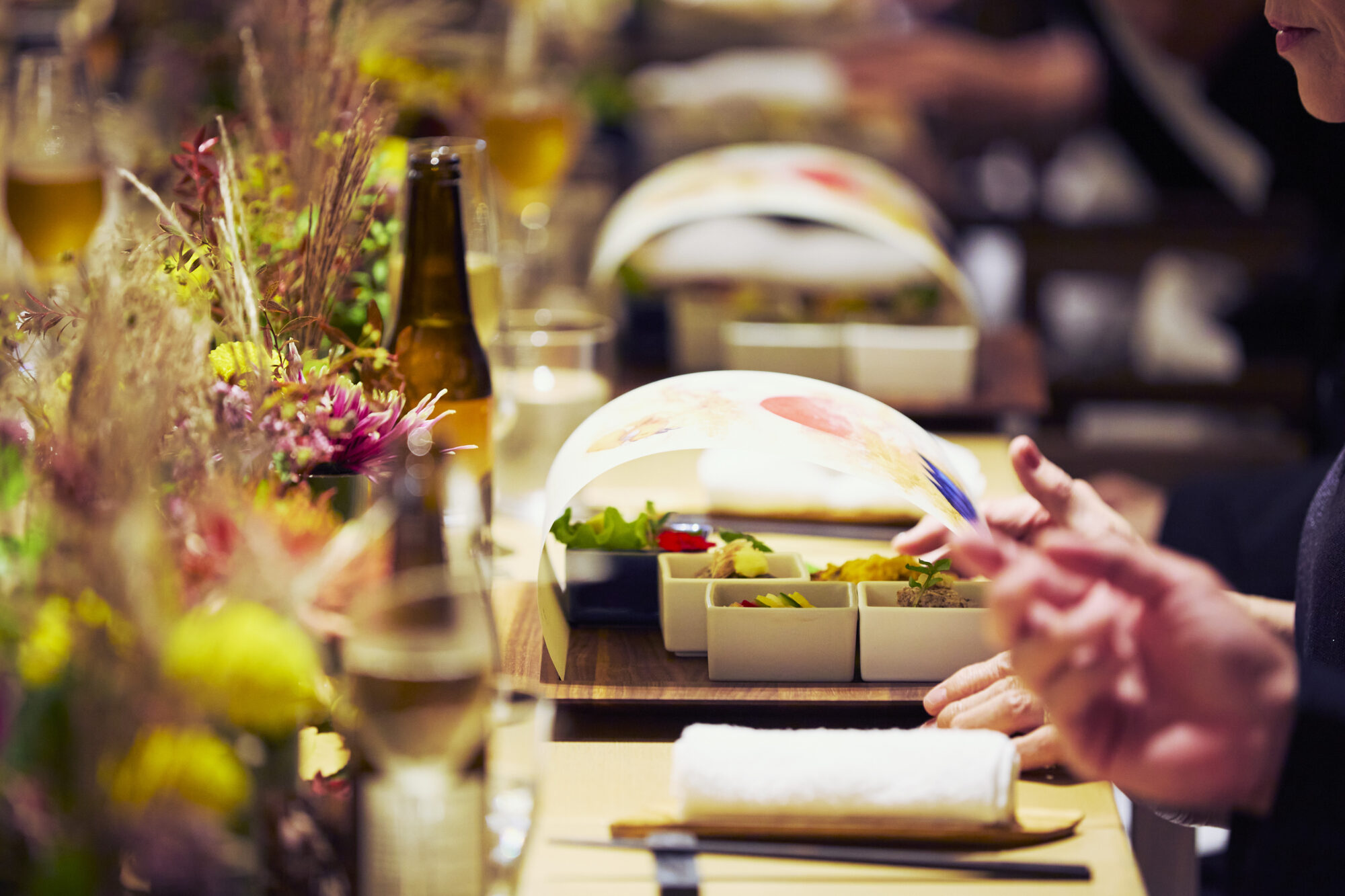 料理は、Wakiya、ときと、SORANO HOTELによるコラボレーションで構成された全9品の特別コース。立川の「あみちゃんファーム」のエディブルフラワー、「伊藤養鶏場」の東京うこっけい、奥多摩のわさびや秋川和牛など多摩地域の食材もふんだんに使用した特別メニューを提供。卓上には「蔵の花屋 コトハ」が手がけたフラワーアレンジメントが彩りを添えた。