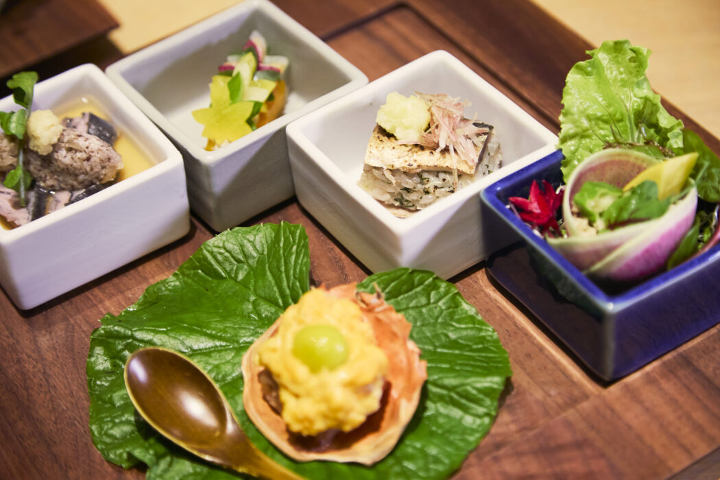 上海蟹、秋刀魚の棒寿司、東京うこつけい冷製茶蒸し、DAICHIの恵みサラダなどシェフそれぞれの個性が際立つ構成