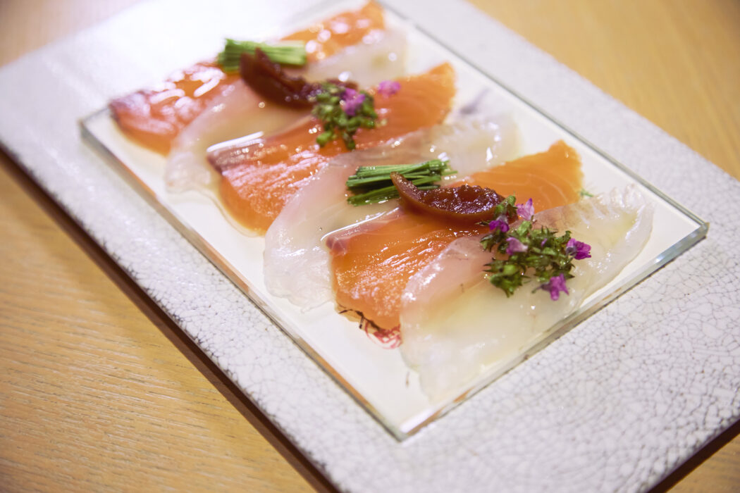 北海道標津町を拠点とする漁師集団「波心会」の天皇献上のサーモンと松皮かれいの「お造り」に、立川産南高梅の醤油漬け等の薬味をあしらって