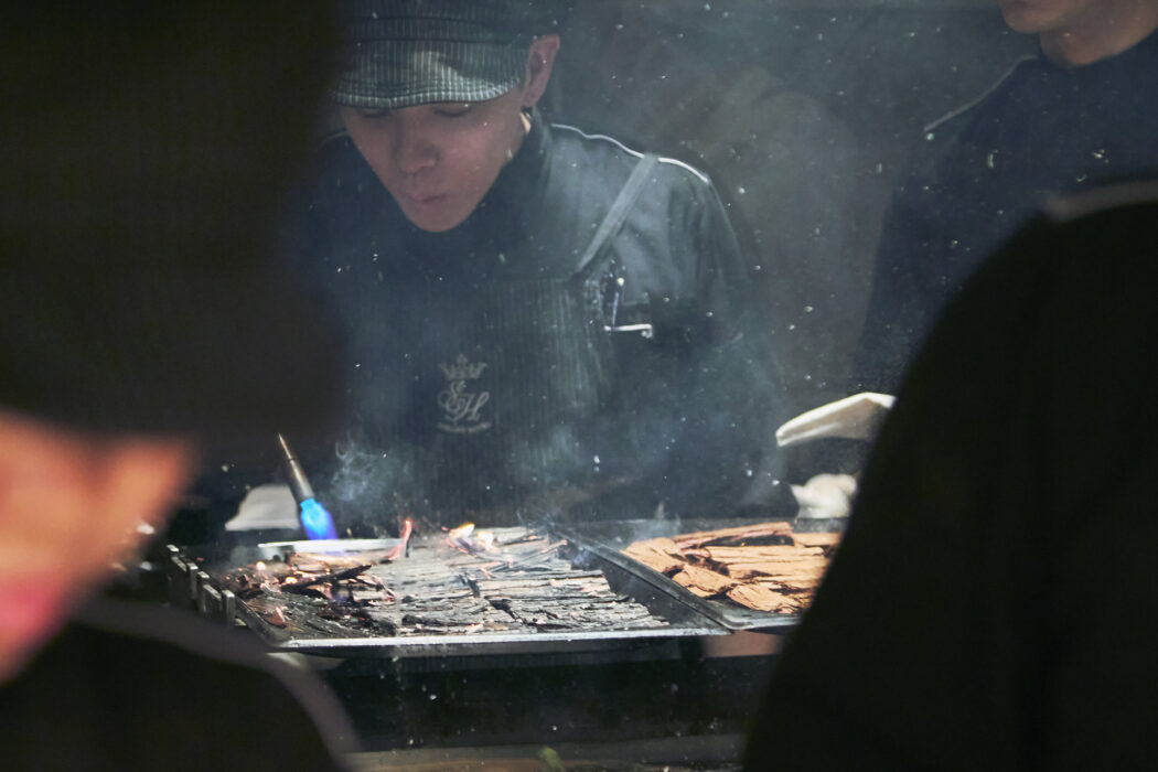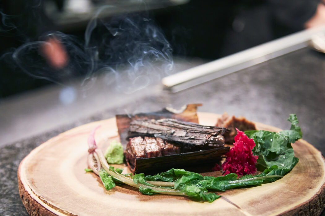 メインの肉料理「秋川牛フィレ肉」に使用する多摩産杉皮が丁寧に焼き上げられていく
