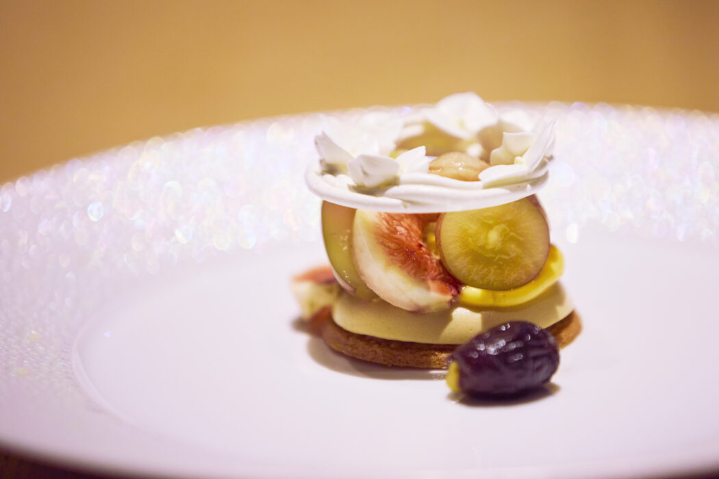 ときと 黒岩ペストリーシェフの「赤葡萄といちじくのタルト仕立て」。見た目の可憐さと上品さがディナーの余韻を静かに包んだ
