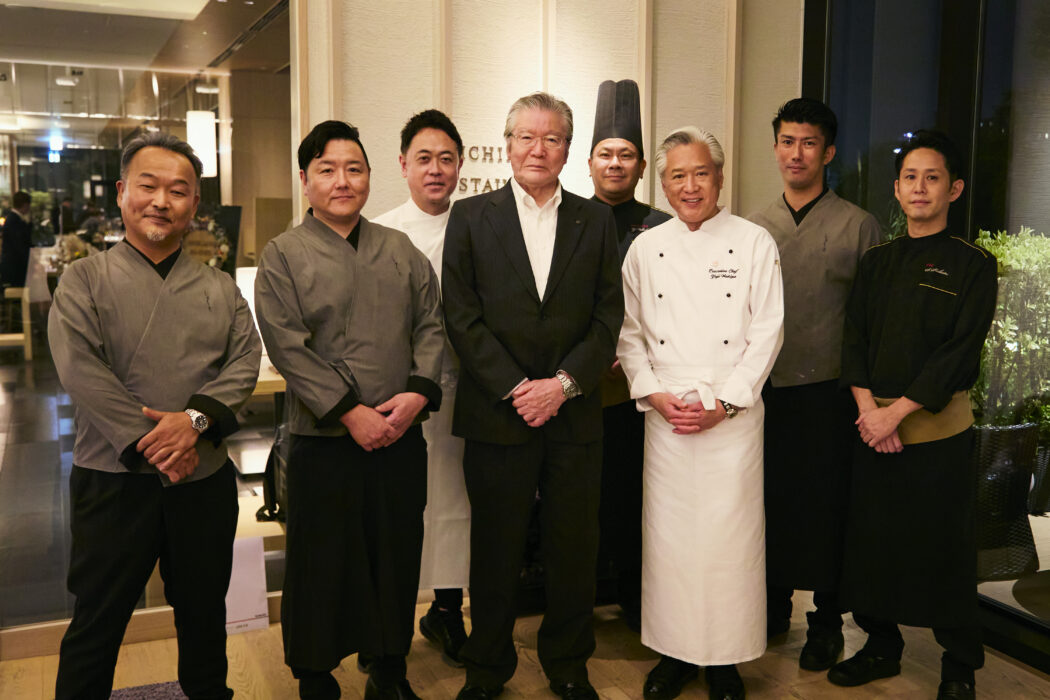 (写真左から)ときと 石井総合プロデューサー、ときと 大河原総支配人・料理長、Wakiya 小澤統括料理長 、立飛HD 村山代表取締役社長、SORANO HOTEL 福原総料理長、Wakiya 脇屋友詞シェフ、ときと 日山シェフ、SORANO HOTEL 柴田シェフ