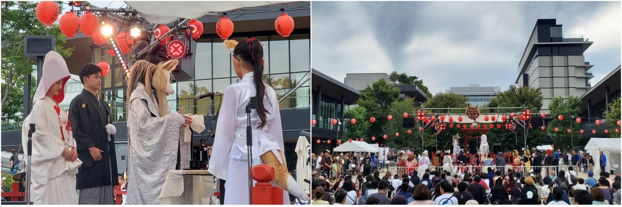 狐の巫女を先頭に、新郎新婦。そして大勢いの狐たちが練り歩き、狐たちと人々が見守る中、厳かに「結びの儀」が執り行われ、会場からは大きな祝福の拍手が沸き起こった。